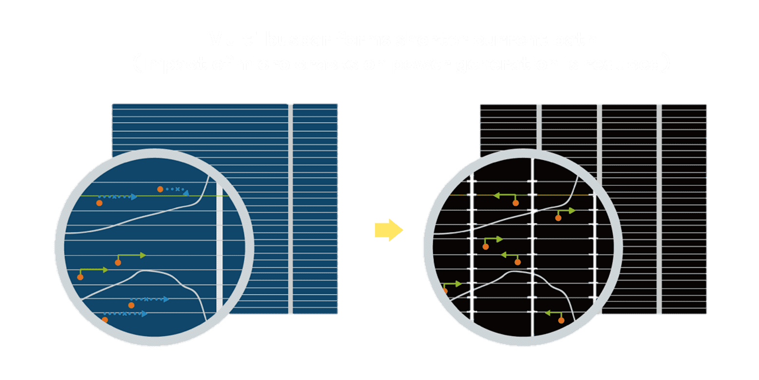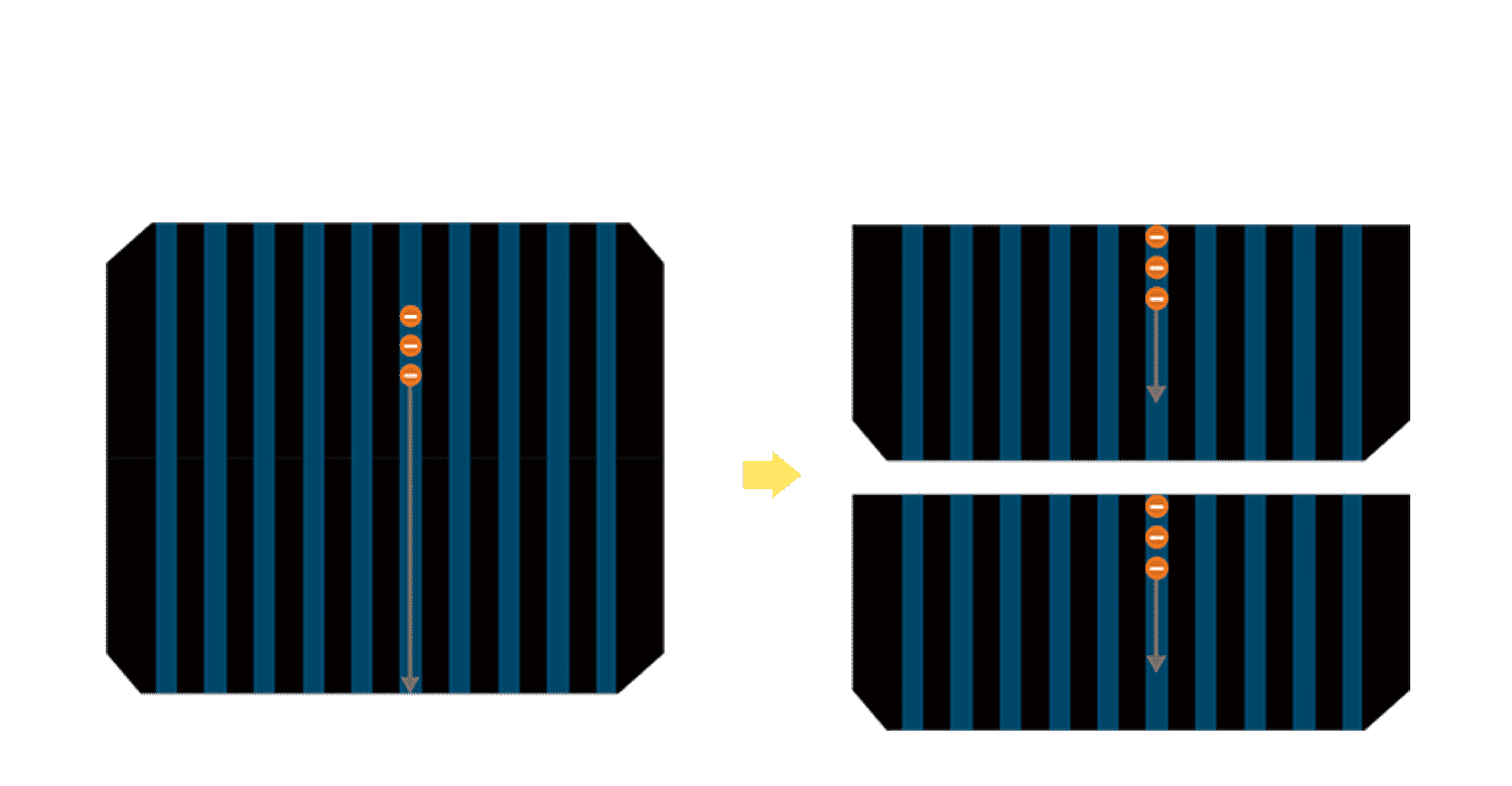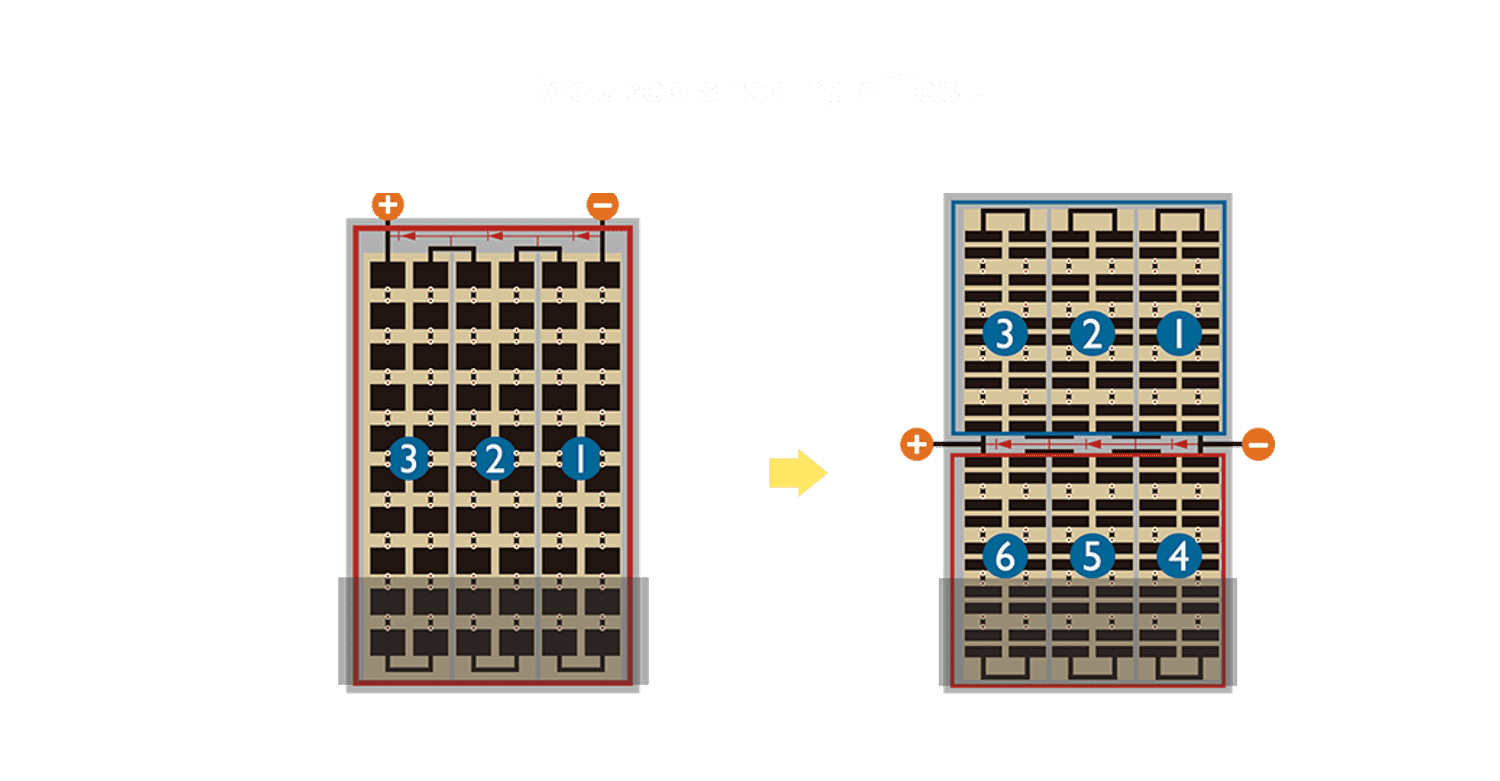 - 结合半切电池,,,,降低遮阴影响、、、、提升模组抗隐裂能力、、、、并减少电阻损耗,,进一步提升模组发电效能。。。